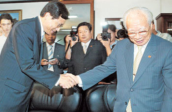 18日,开放的我们党议长辛基南(左)来到汉城汝矣岛光复会,对父亲的亲日行为向光复会会长金祐铨道了歉。虽然辛基南要求接受谢罪,但金祐铨并没有做出明确答复。