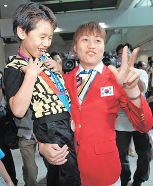 31日,获得2004雅典奥运会女子手球银牌的韩国女子手球队队员吴成玉在仁川机场出口抱着儿子金胜龟(音译),向前来迎接的人们表示感谢。在雅典奥运会上,韩国代表团以9金、12银、9铜的总成绩(第9名)成功进入了前10名。当天,韩国代表团结束17天的激战,利用包机回国。