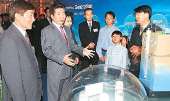 7日,卢武铉总统(左二)出席了在汉城三成洞贸易中心大西洋厅举办的“第5届中小企业技术革新展”,向开发新技术并推出产品的中小企业代表表明了培养中小企业的意志。