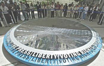 即将迎来“9.11”恐怖事件3周年纪念日的9日,在美国洛杉矶国际机场内,乘客和机场工作人员在命名为“规范的世界”的造型物前,为恐怖事件的死者举行了悼念活动。