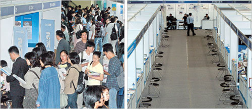 在历史上最恶劣的就业难情况继续出现的13日下午,汉城大学举办了学校成立以来的首次招聘博览会。安排在文化馆的优秀企业馆内求职者络绎不绝(左),但安排在体育馆的中小风险投资企业馆内显得有些冷清。当天除汉城大学学生外,还有很多其他大学的学生也参与其中,引起了人们的关注。