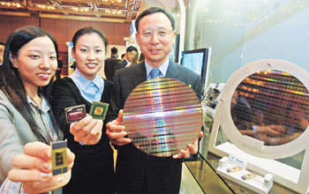 20日,三星电子半导体部门总经理黄昌圭(右)在汉城中区奖忠洞新罗酒店举行的记者招待会上,展示了三星电子公司最先开发出的线路宽度为60纳米,容量为8G的NAND型快闪内存产品。