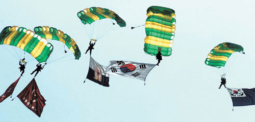 在建军56周年国军日(下月1日)即将来临之际,24日,在忠南鸡笼市鸡龙台练兵场,特种部队官兵们正在进行展开太极旗等旗帜的跳伞练习。