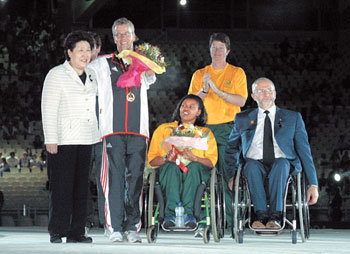 “送给展示希望的勇气的你!”140个国家的4000多名选手参加的2004年雅典残奥会于29日上午(韩国时间)结束了为期12天的激战。在闭幕式前,在此次大赛上展示无比勇气的选手获得了“黄年代克服奖”。“黄年代克服奖”是为纪念身为小儿麻痹残疾人,30年以来为残疾人福利活动做出杰出贡献的韩国残疾人福利振兴会副会长黄年代的功绩,在1988年制定的奖项。左起为,黄年代、休米特(双臂残疾乒乓球选手、德国)、休图(脊椎残疾田径选手、南非共和国、以上为男女获奖者)、残奥会主席克莱文。