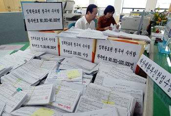 图为汉城阳川区厅税务科职员们正在整理有关将从9日开始退还给居民的财产税的财产税退还申请表。阳川区在汉城的自治区中第一个做出了追溯减免 20%财产税的决定,并将通过银行账户向9.9万人退还26.65亿韩元。决定追溯减免财产税的钟路区、冠岳区、中区等其他9个区厅也计划在今年内退还减免的财产税。