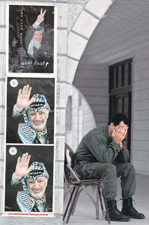 야세르 아라파트 팔레스타인 자치정부 수반이 사망한 11일 가자지구의 팔레스타인 경찰서 벽에 나붙은 그의 사진들. 자치정부는 앞으로 40일간을 아라파트 전 수반 애도기간으로 정했다.