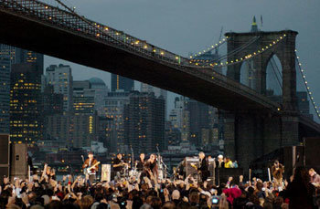 图为22日,爱尔兰摇滚乐队U2在纽约布鲁克林桥下举行演出的现场。时隔4年,U2将于下周推出专辑《如何分解原子弹》。