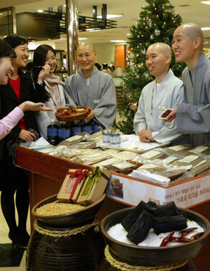 现代百货店汉城狎鸥亭店从22日开始到28日出售京畿抱川市一座寺庙的比丘尼们用传统方式制作的大酱、辣椒酱、酱油、清麹酱。每公斤大酱、辣椒酱、清麹酱的价格分别为1.3万韩元、2.5万韩元、1.5万韩元。
