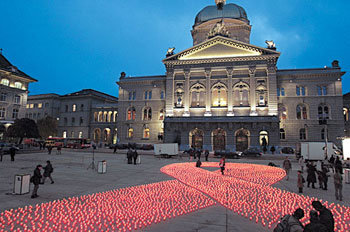 1日,瑞士艾滋病预防组织在伯尔尼政府大厦前广场,用蜡烛组成了红色丝带形状的预防艾滋病标志。1日是世界艾滋病日,6000个蜡烛意味着在非洲每天因艾滋病死亡的人数。