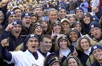 4日,美国总统布什(后排中)出席了在美国费城举行的陆军和海军体育活动开幕式,与拉拉队共度了快乐的时光。