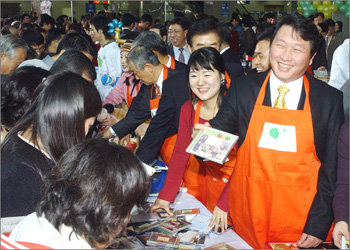 10日,包括总裁崔泰源在内,SK集团主要子公司的首席执行官(CEO)和职员等120多人在汉城龙山站韩国高速铁路(KTX)驿站举行了“爱心义卖”活动。