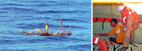 图为,3日,沙普特拉(音译)向马来西亚货船拼命挥手(右)。沙普特拉于去年12月26日在印度尼西亚亚齐省海边被地震海啸席卷,在印度洋漂流了9天。被船员拉上船后,沙普特拉放松之下昏了过去。照片由货船船长拍摄。