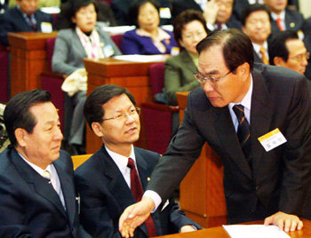 5日就任开放的我们党临时党议长的林采正(右)在当天举行的议员总会中央委员会联席会议上,向金爀珪议员(左)伸手致意。林采正在当天的记者招待会上表示:“在困难时期充当救援投手。”