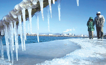 9日早晨,汉城最低气温降至零下10.3度。气象厅预测,10日早晨的气温将更低,有可能创下今冬最低低温。9日上午,在汉城汝矣岛停船场设置的固定防止浮油物质扩散的栅栏的绳索上结满了冰锥。冰锥是海水冻结在绳索上形成的。