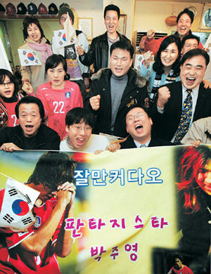 沉闷的世界因“足球天才”朴周永(高丽大学队)充满快乐。27日,在2005卡塔尔8国青年足球邀请赛韩国队与日本队的决赛进行时,“大~韩民国”的喊声响彻了全国的夜空。当天,朴周永攻入2球。在4场比赛中,他共打进9球,获得了得分王和最佳球员的荣誉。图为“朴周永球迷俱乐部”的成员们看着电视直播的决赛,正在助威。