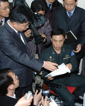 正在审理陆军将军级晋升腐败案的国防部普通军事法院15日对陆军本部人事参谋部实施了建军以来的首次现场验证。当初录制晋级审查过程的负责闭路监视(CCTV)工作的将校(右)正在向前来进行现场验证的相关人员说明当时的情况。