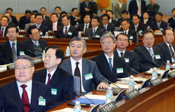 16日上午,在首尔外交通商部大厦国际会议厅举行了“2005年驻外公馆馆长会议”。包括驻日大使罗钟一(前排左)在内的驻外公馆馆长正在倾听外交通商部长官潘基文的北核事态分析内容,并积极讨论对应措施。