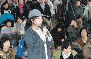19日,参加“面向青少年的市场经济讲座”的张光范(左)家人在讲座结束之后正在谈话。