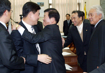 国会建设交通委员会23日通过了“新行政首都相关特别法”制定案之后,大国家党唯一的忠清圈议员洪文杓(左2)和建交委的干事朴炳锡议员(开放的我们党)拥抱在了一起。该法案预计将在通过法制司法委员会之后,在3月2日的正式会议上得到处理。