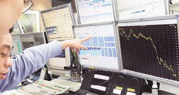 10日,在首尔外汇市场上盘旋着紧迫感。当天,韩元兑美元的汇率一度下跌到989韩元,之后又飙升到了1008韩元,呈现出过山车般的长势,最终因外汇当局的强力介入而以1000.3韩元收盘。图为,韩国花旗银行的外汇销售商正一边看着外汇行情表,一边进行紧急协商。