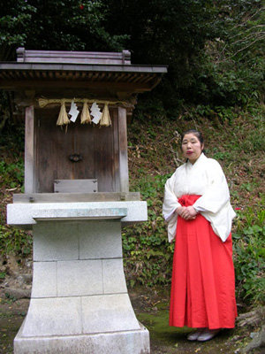 日御崎神社守护者石田贵子(音译)正在对简陋的韩国神社标识进行介绍。该韩国神社标识是在日韩国同胞于1996年代替已消失的韩国神社设立的。出云(位于日本岛根县)