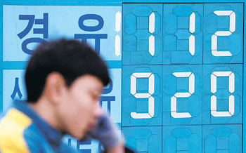 由于国际油价猛涨,国内加油站出售的石油产品价格也随之上涨。21日,在首尔西大门区弘济洞一家加油站,每升柴油的价格达到1112韩元。