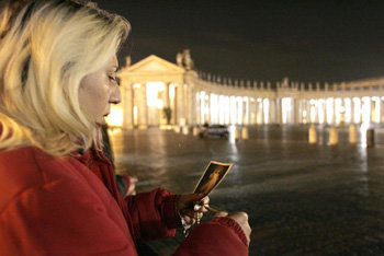 全球10亿多天主教信徒的领导者,世界天主教教皇约翰·保罗二世病情加重。全世界天主教信徒都在祈祷教皇早日恢复健康。4月1日,一个女信徒在梵蒂冈圣彼得广场,正在拿着默珠为教皇祈祷。