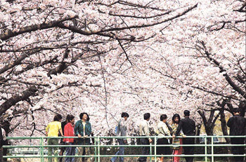 举国上下充满了春天的气息。8日,经过庆南镇海市余佐洞的“樱花隧道”的赏春游客(左)和走在首尔城东区鹰峰山的连翘小山上的小朋友脸上的表情犹如这个季节一样光彩照人。