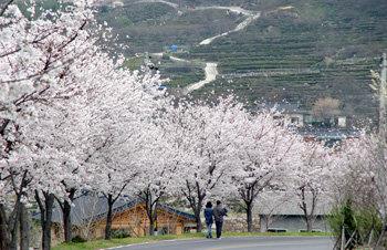 在三叉道右转进入前往求礼的道路。和第19号国道不一样,行驶车辆特别少,寂静无比。樱花树并排立在道路两侧,是赏樱花的好地方。但发出感叹还为时过早。因为,只要继续向前行驶,就能抵达樱花成海的蟾津江边。其入口是,大平村(求礼郡艮田面)三叉道。在这里右转就再次进入伸向“文涉书圣痷”的第861号道路。