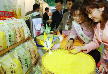 22日,展示各种有关健康生活产品的“Natural & Well being Fair2005(2005自然健康生活展)”在首尔江南区三成洞韩国贸易中心印度洋大厅举行。图为,观众们正在惊奇地观察绿茶大米和氨基酸大米等颜色漂亮的大米。
