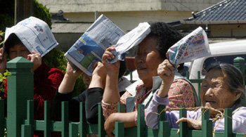 26日,在庆北永川市北安面林浦里范进公寓(音译)前,选民们正在聆听竞选该地区国会议员及市长再补选的大国家党候选人的游说。