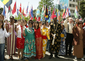 迎来建校120周年的首尔延世大学于2日举行了“延世全球庆典”。图为,参加庆典的60多名外国在校生身着本国的传统服装,进行游行。
