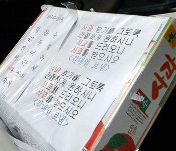 图为,19日上午,在首尔大国家党党部,以兵风疑惑事件的主角金大业的名义进行邮递,结果受到废弃除理的苹果箱子。