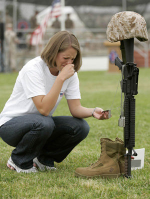 26日,出生于美国肯塔基州列克星敦的埃米利安诺•蒂勒夫(音译)在加利福尼亚州彭德尔顿营手里拿着丈夫的军籍号码牌痛哭。哀悼在伊拉克阵亡的第1海军师420名士兵的追悼仪式于当天举行。自2003年3月占领伊拉克后,至少有1647名美军士兵阵亡。