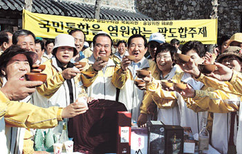 作为在全北茂朱度假区举行的研讨会的一个环节,包括议长文喜相、院内代表丁世均在内的开放的我们党的议员及中央委员在31日来到德裕山雪天峰,举行了希望国民统合的“八道合酒祭”活动,并一起干杯。