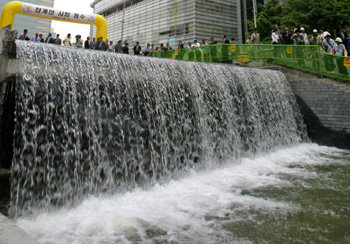 在复原工程动工1年11个月的1日,清溪川重新流淌了清澈的水。人们从首尔广津区紫阳引水场和地下铁车站引出水后,利用抽水机抽调到钟路区世宗路总公司前的清溪广场喷水台,然后利用产生的落差使水经过清溪川流入汉江下游。