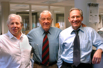 上月31日,首次曝光“水门事件”的《华盛顿邮报》记者伍德沃德(右)和伯恩斯坦(左)在《华盛顿邮报》的编辑部,与主编本•布拉德利会晤。