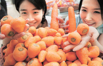 3日,在首尔中区小公洞乐天百货商店总店蔬菜卖场,像球一样圆圆的胡萝卜首次露面。比一般的胡萝卜更甜的这种胡萝卜,是在庆南金海地区栽培而成。价格为每100克400韩元,比一般胡萝卜(100克320韩元)贵一些。其种子来自欧洲。