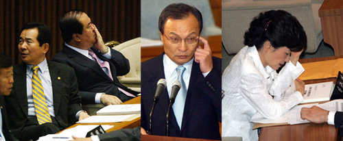 图为,4日韩国国会全体会议就政治领域问题对政府提问中,国务总理李海瓒在接受议员们的提问时,正在扶正眼镜(中)。当天,开放的我们党议长文喜相以一脸疲倦的表情坐在全体会议现场,坐在旁边的院内代表丁世均正在向一位议员询问疑问内容(左)。大国家党代表朴槿惠正在从院内首席副代表任太熙处听取院内对策报告。