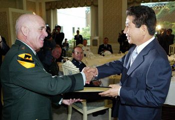 8日,卢武铉总统邀请驻韩美军司令官拉伯特(左)等驻韩美军领导层的7名将领到青瓦台举行了午餐恳谈会。图为,拉伯特正在向卢武铉总统转达参加过6•25战争的已故预备役中校卡夫拉(音译)的遗物“1953年2军团建立1周年纪念相册”。