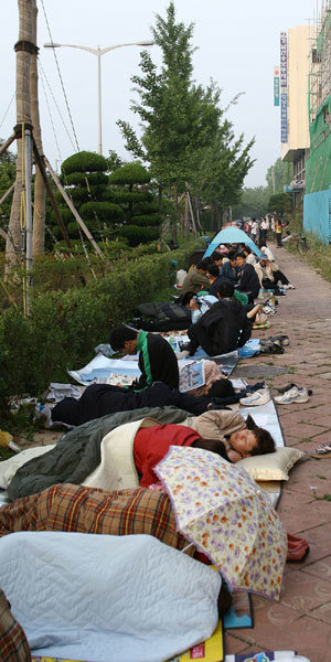 在首尔等首都一些地区才能看到的订购热潮扩散到了地方。图为,14日上午,在“De city 7 XII”样品房所在地庆南昌原市上南洞周围的人行道上,通宵等待的购房者们躺在席子上和帐篷里,等待自己的顺序。