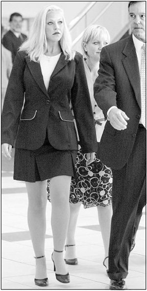 16日,因涉嫌与14岁学生发生性关系而被起诉的美国女教师黛布拉•拉法弗(24岁,左)与律师一起出现在佛罗里达州坦帕市法庭上。拉法弗因涉嫌于去年辗转2个县与学生发生性关系,很有可能被判30年徒刑。继1996年与小学6年级学生发生性关系被判7年零6个月徒刑的女教师玛丽•凯•雷图诺(43岁)之后,拉法弗事件再次轰动美国。雷图诺最近和已成年的该学生结婚。
