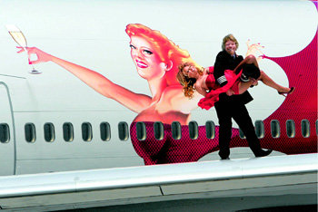21日,英国维京大西洋航空公司创业者理查德•布兰森总裁迎接航空公司创立21周年,站在美国纽约肯尼迪机场本公司飞机的机翼上,抱着电影演员帕梅拉•安德森,摆出了“飞翔的女人”造型。
