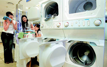 28日,洗衣机和烘干机组合在一起的洗衣烘干机在首尔中区小公洞乐天百货店家电专卖场亮相。该产品由美国美泰克公司生产,下面是洗衣机,上面是烘干机。百货店解释说,它利用煤气散发的热气进行烘干,因此能节约电费。截止到下月17日,乐天百货店将以每台让利50万韩元的399万韩元出售该产品。