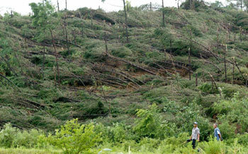 1日,因暴雨和强风江原春川市南山面附近的树木像稻穗一样被放倒。因疾风该村庄有22处住宅和中学校园的200多棵树木受灾。虽然1日下午雨势有所减弱,但是气象厅预测,从3日开始会重新出现暴雨。