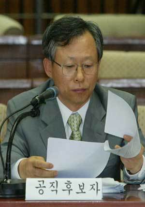 图为,4日,韩国宪法法院审判长候选人曹大铉正在国会人事听证特别委员会上阅读材料并做答辩准备。