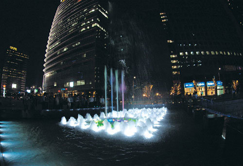 将成为清溪川复原起点的清溪广场喷水台于6日下午亮相。虽然清溪广场的正式开放日为10月1日,但由各色照明灯相互辉映的露天喷水台将暂时试验启动。