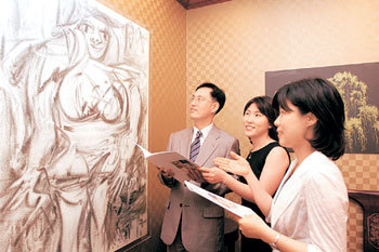 7日,来到首尔江南区道谷洞国民银行道谷私人事务银行中心的顾客们正在聆听Pyoart的馆长对“MIJA”的说明。MIJA的作者是刘承浩(音译)。