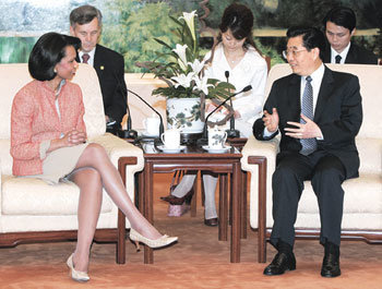 图为,正在巡访亚洲4国的美国国务卿赖斯10日在访问第一站中国与中国国家主席胡锦涛进行会晤。由于赖斯的巡访与北韩宣布重返六方会谈的时间相重叠,因而备受关注。