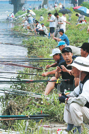 从星期六开始的阴雨天气到10日终于雨过天晴,在首尔中浪桥周边,“姜太公”们聚在一起,垂着鱼杆,正在等鱼上钩。
